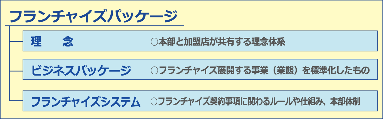 フランチャイズパッケージは、下図のように、理念体系、ビジネス・パッケージ、フランチャイズシステムで構成されます。