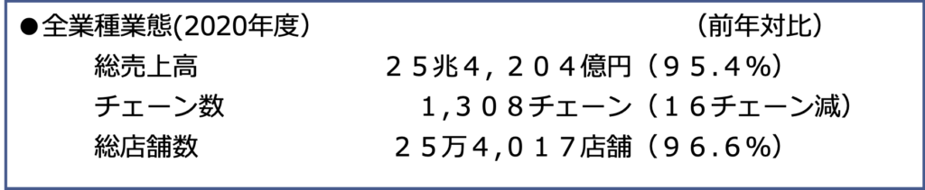 コロナ禍の影響で全体としては、売上高、チェーン数、店舗数共に前年よりも大きく減少となってしまいました。売上高は25兆4,204億円(前年対比△4.46%)、チェーン数は、1,308チェーン(前年対比△16チェーン)、総店舗数は25万4,017店(前年対比△3.4%)となっています。